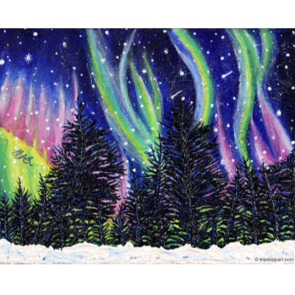 Dans ce paysage nordique, on y voit ces phénoménales aurores boréales vertes, bleues, rose, mauves et lilas qui illuminent et animent ce ciel d’un magnifique bleu outremer. C’est l’hiver et la neige tombe tout doucement sur cette forêt de conifères.